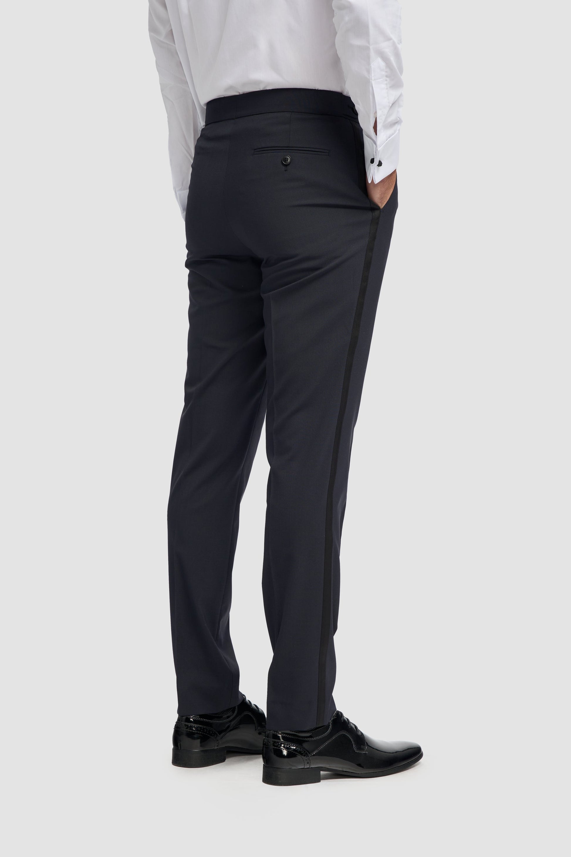 The Midnight Navy Two-Piece Suit blends timeless elegance with modern tailoring. Featuring a sleek shawl collar and single-button closure, this wool-blend suit is fully lined for a polished finish. Designed with versatility and comfort in mind, it’s the perfect choice for formal events, refined gatherings, or evening sophistication. The Midnight Navy trousers showcase a streamlined silhouette, elegant detailing, and impeccable tailoring for a look that exudes modern refinement.