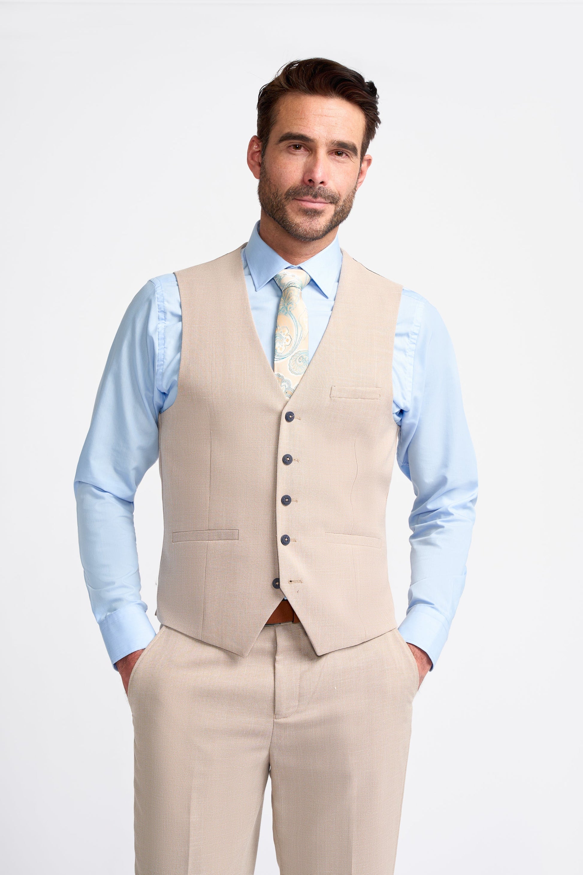 The Miami beige three piece suit offers a perfect balance of style and comfort. Part of the Miami collection, this suit showcases a sophisticated beige colour, ideal for both formal and smart-casual occasions. Whether you’re attending a wedding, a business meeting, or a summer celebration, the Miami beige three piece suit adds a touch of elegance and effortless style to your wardrobe.